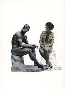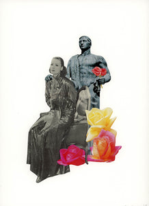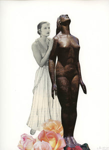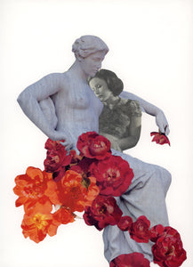 These prints are based on an ongoing series of collages where the interaction of the human/ personal with the monumental/ historical ‘activates’ the image of a statue, which abandons its rigidity to become human, be vulnerable, and ‘mingle’ with characters of various genders. The mini-stories they tell are usually of a ‘romantic comedy’ style, working also as a commentary about gender roles and power. There are four groups in this series: Brides (from a vintage catalog about the history of bridal gowns), Movies (from catalogs of movie stars like Greta Garbo), Romance (from covers of pulp novels) and Life (from vintage Life magazines), all in combination with images of public statues, and additional misc. items such as flowers and every day objects.